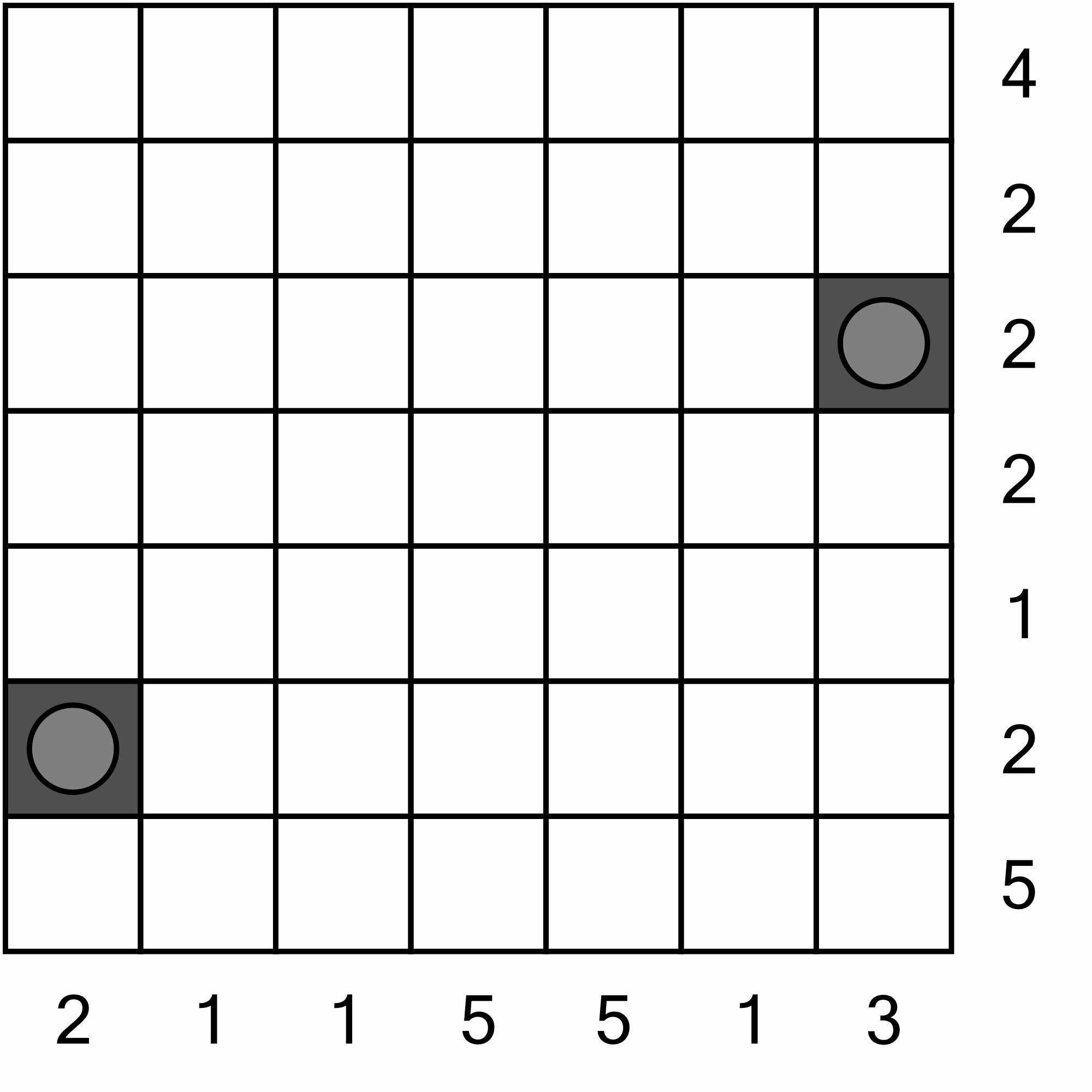 Note: The numbers represent the total numbers of squares marked as part of the path in that row/column and this can be broken down into smaller parts. For example 5 marked outside the row could be 5 cells marked consecutively or could be, for example, 2 and 3.